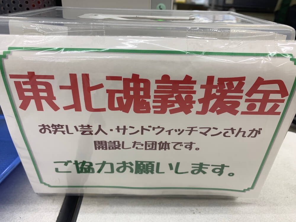 東北魂義援金って知っていますか?うちのお店のレジにはこのような募金箱が置いてあります。